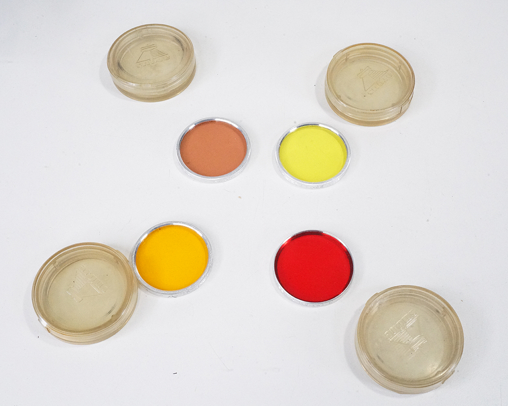 LOT OF FOUR 41MM SLIP IN FILTERS (SERIES VI), TWO DIFFERENT YELLOW, RED AND PALE ORANGE (WARMING), WITH CASES, LOOKS EX