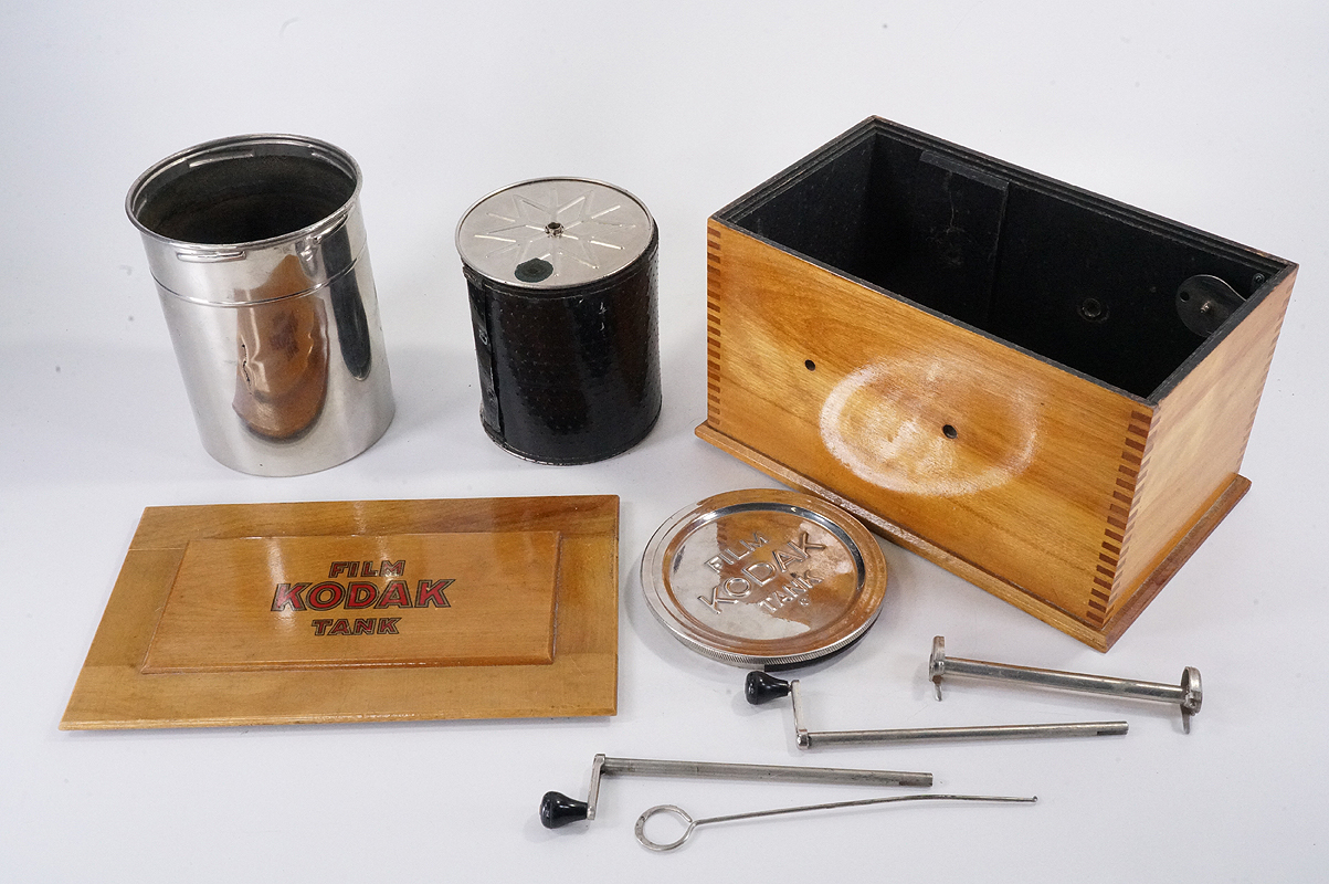 FILM TANK 2-1/4, WITH OUTER SLEEVE, INNER SLEEVE, TWO HANDLES, SPOOL, STEEL TANK B, APRON AND BROKEN TUBE OF EASTMAN UNIVERSAL DEVELOPING POWDER, AREAS OF CORROSION, SOLD AS-IS FOR DISPLAY PURPOSES ONLY, LOOKS EX/EX-