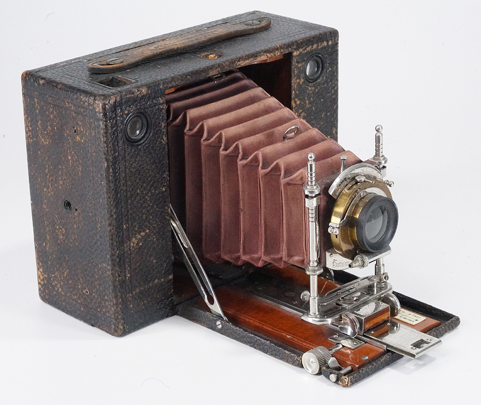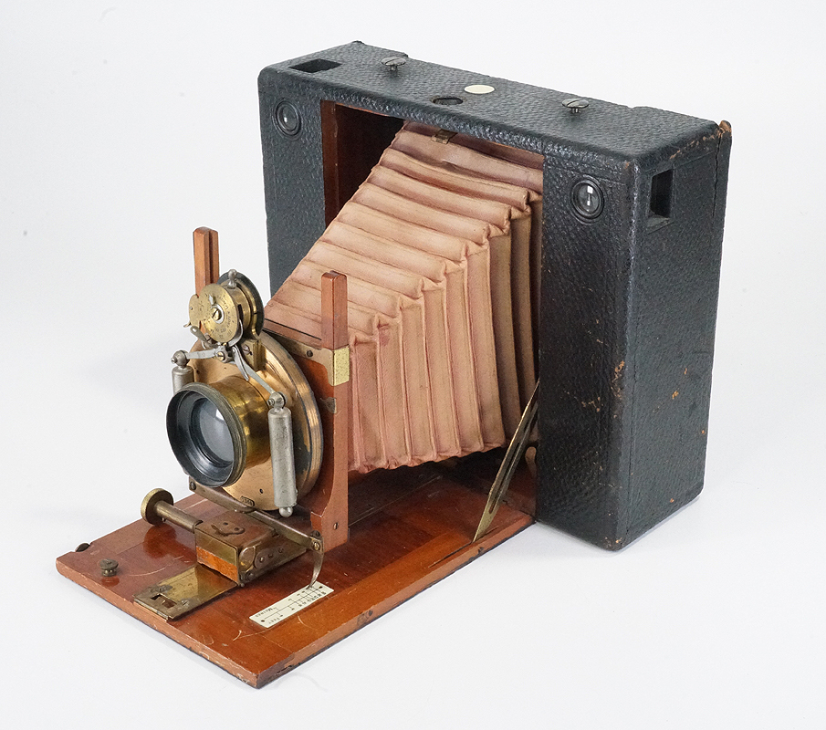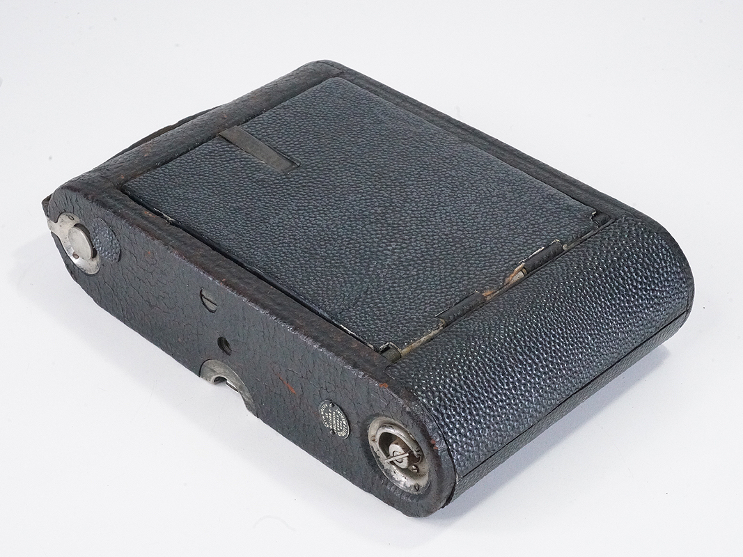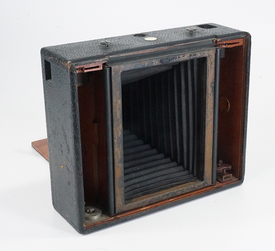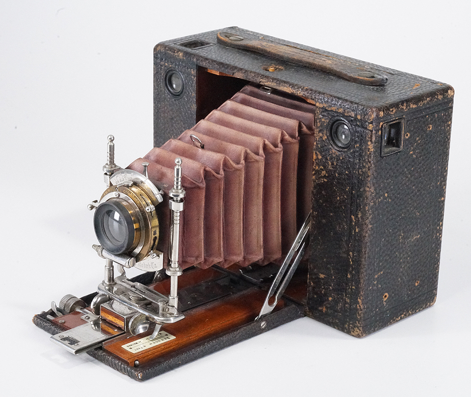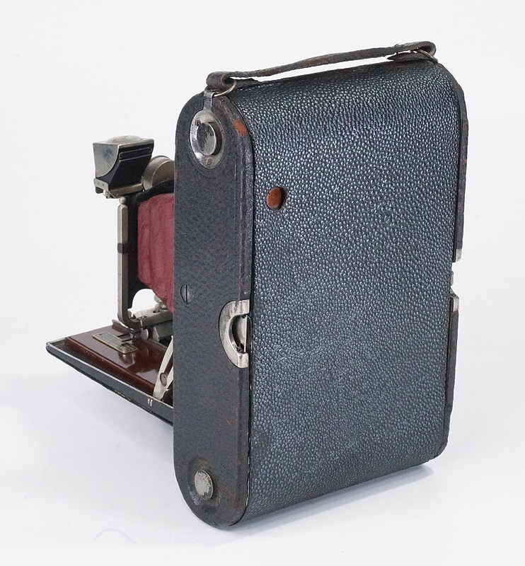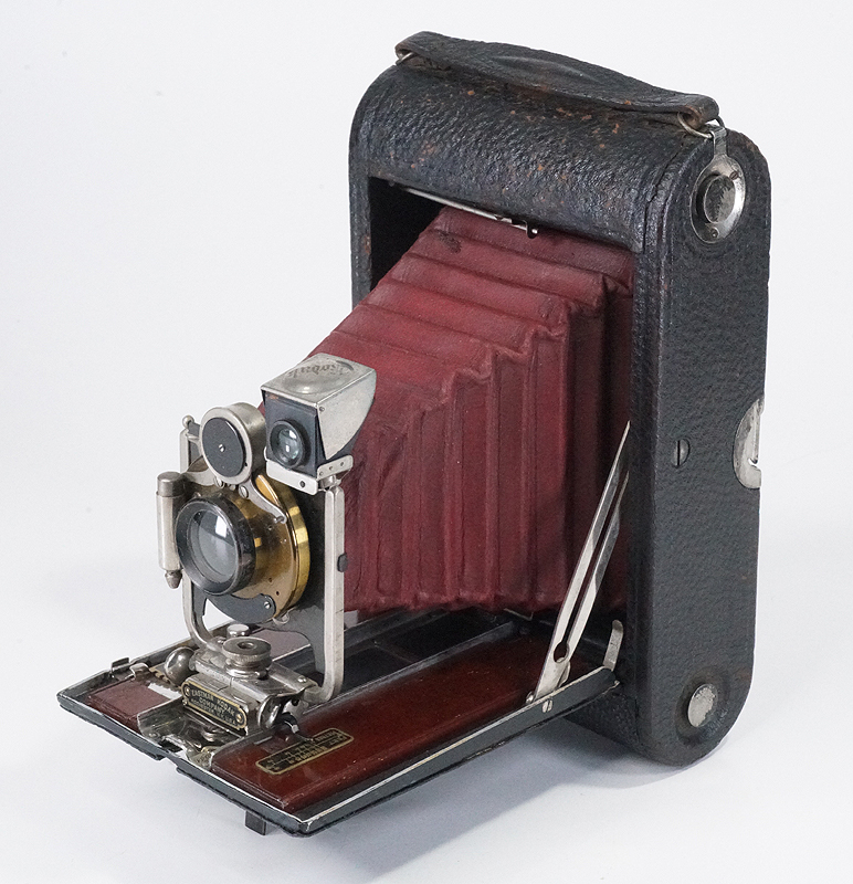 NO. 4A FOLDING MODEL A, BURGUNDY BELLOWS, USES 126 ROLL FILM, WITH WOODEN BOX (LID IS ONLY PROPERLY RETAINED ON TWO EDGES), EMPTY SPOOL AND INSTRUCTION BOOK, SHUTTER IS STICKY AND DOES NOT FUNCTION CORRECTLY, ADVANCE KNOB NOT UNIDIRECTIONAL, LENS BOARD SLIGHTLY LOOSE IN ITS MOUNTING, BUBBLE LEVEL DEFECTIVE, FINDER MIRROR DEGRADED, SCREW MISSING FROM RISE ASSEMBLY, SOLD AS-IS FOR DISPLAY PURPOSES ONLY, LOOKS EX/EX-