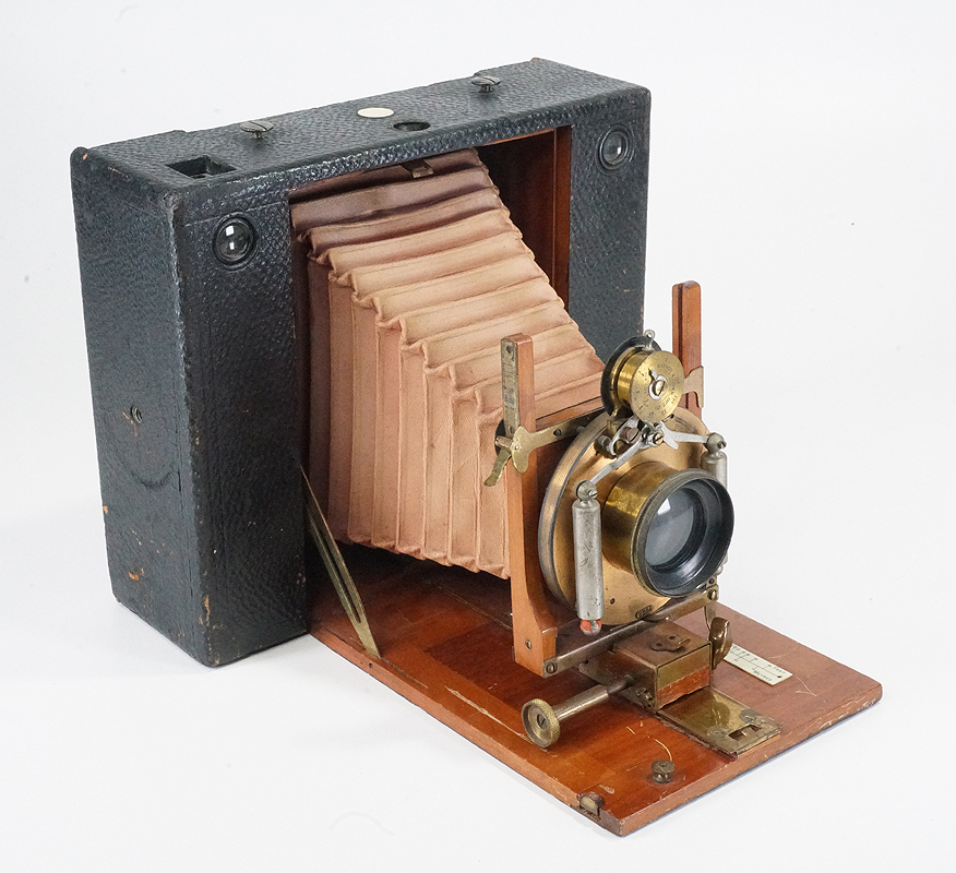 NO. 4 CARTRIDGE KODAK, MODEL E, WITH ONE FILM SPOOL, RAPID RECTILINEAR LENS, SHUTTER WORKS, GLASS HAS SOME INTERNAL HAZE, FRONT STANDARD IS DIFFICULT TO EXTEND OUT ON THE RAIL, BELLOWS APPEAR LIGHT TIGHT, BUTTON TO OPEN THE CAMERA IS MISSING ITS LEATHER AND A SMALL PIECE OF WOOD HAS REPLACED THE BUTTON, BACK DOESN'T LATCH, LOOKS EX-