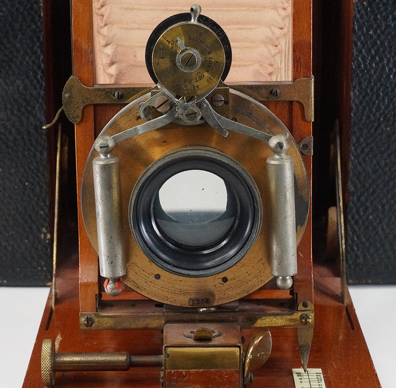 NO. 4 FOLDING POCKET KODAK MODEL B (THEY MUST HAVE HAD BIG POCKETS BACK THEN!), F/6.3 ZEISS KODAK ANASTIGMAT IN OPTIMO, RED BELLOWS, SHUTTER RUNS BUT THE SLOW SPEEDS DRAG A LITTLE, GLASS HAS MARKS TO THE FRONT AND REAR OF THE LENS, LEATHER HAS SHRUNK ON THE BODY, HAS A BIG CRACK ON THE OUTSIDE OF THE BED AND IS MISSING A PIECE FROM THE LOWER FRONT, ELSE LOOKS EX-