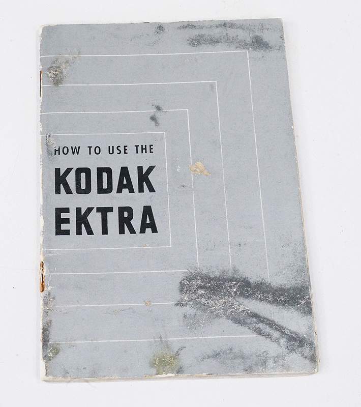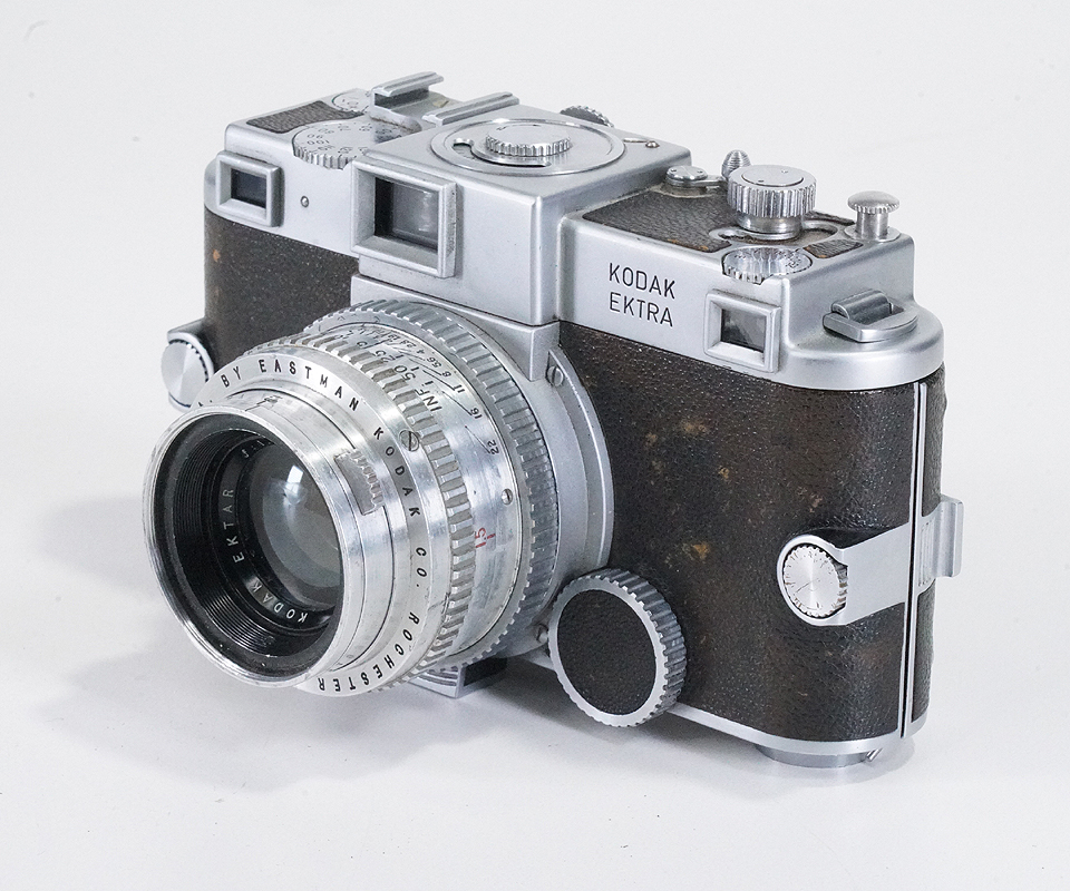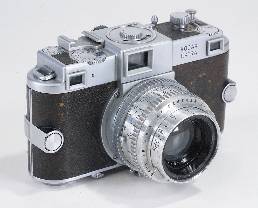 EKTRA, WITH 50/1.9 EKTAR, WORKING ALTHOUGH THE SHUTTER IS NOISY, LENS HAS A LITTLE INTERNAL HAZE AND A FEW CLEANING MARKS, MISSING SOME LEATHER FROM THE BOTTOM AND BACK, ELSE LOOKS EX