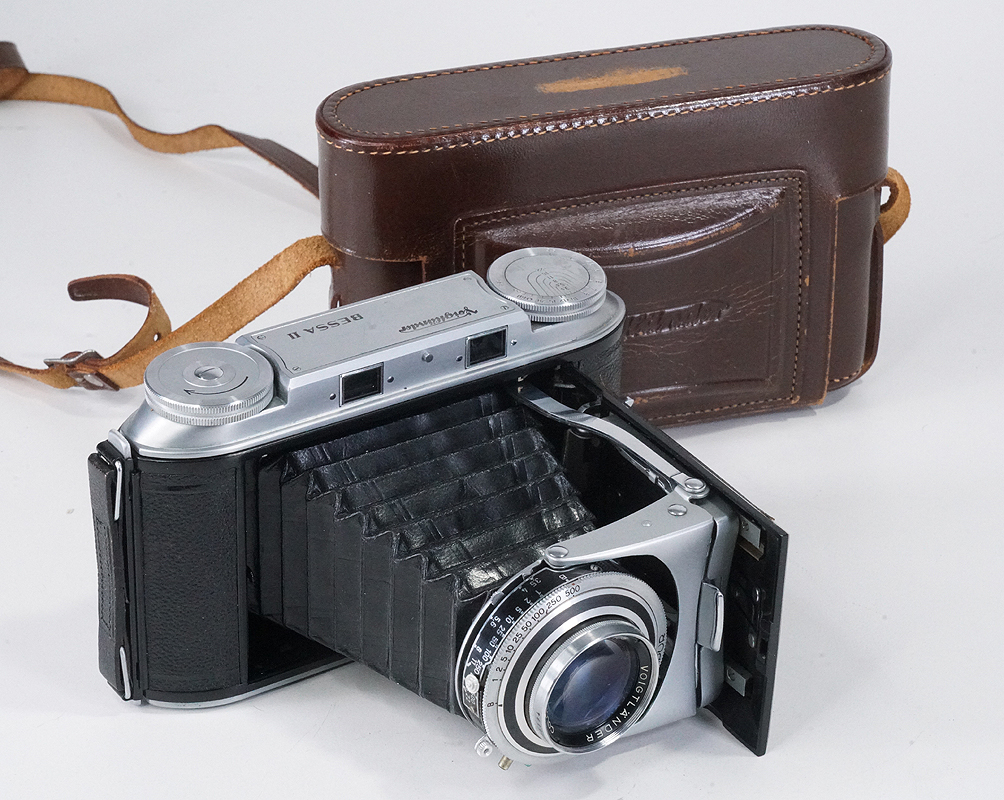 BESSA I, 105/3.5 COLOR-SKOPAR IN PRONTOR-S, 6X9 OR 4.5X6 ON 120 (BUT MASK IS MISSING), WITH WOOD-CORE TAKE-UP SPOOL, SHUTTER JAMMED, SPEED AND FOCUS DIALS STIFF, FOLD-OUT MECHANISM TENDS NOT TO ERECT PROPERLY, LENS/SHUTTER ASSEMBLY SLIGHTLY LOOSE IN ITS MOUNTING, BELLOWS APPEAR LIGHT TIGHT, SOME HAZE PRESENT WITHIN VIEWFINDER, HANDLE ABSENT, LIGHT SCRAPES ON TOP COVER, LETTERING HAS FADED, SOLD AS-IS FOR PARTS OR REPAIR, LOOKS EX/EX-
