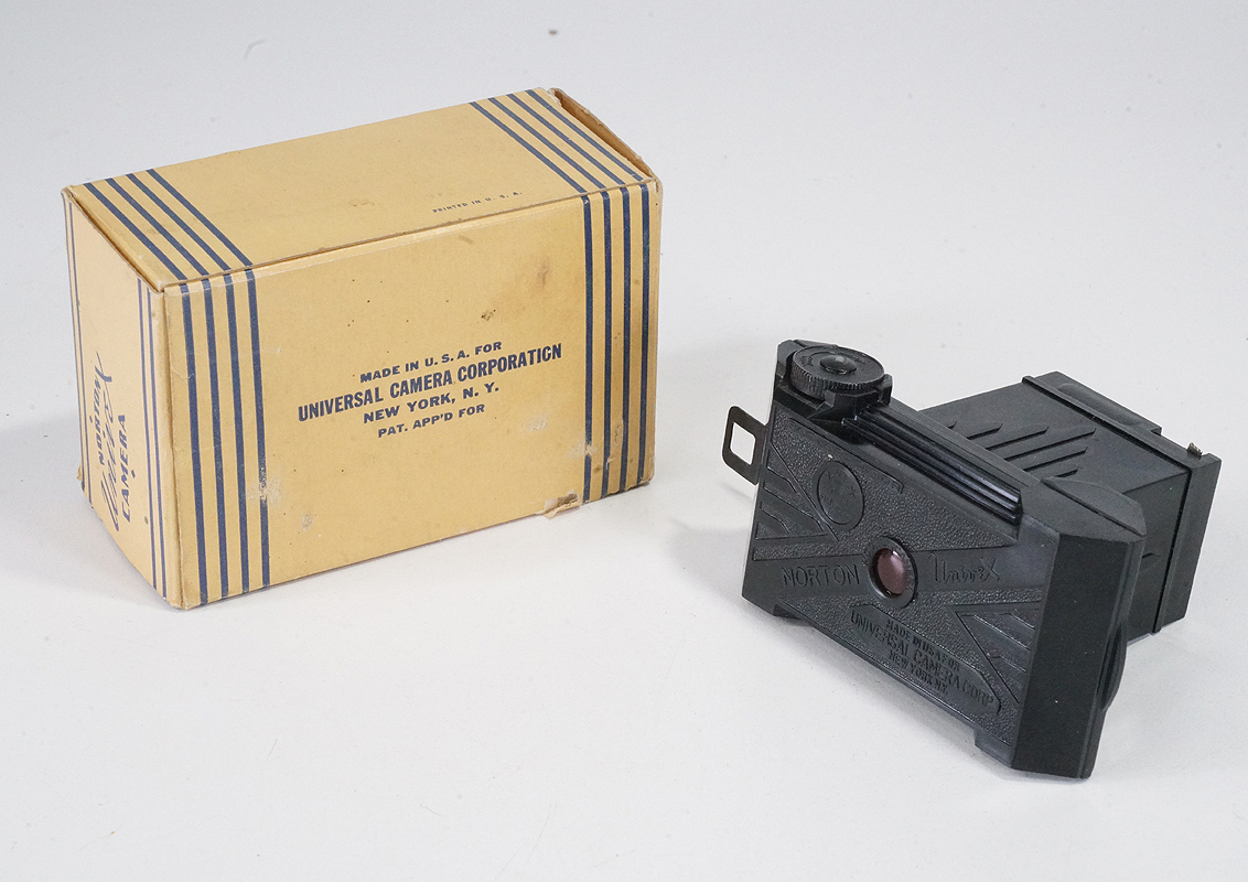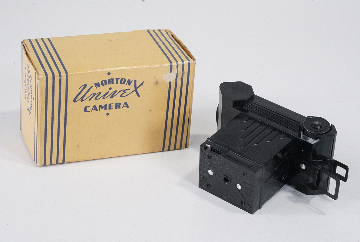 UNIVEX MODEL A, USES UNIVEX NO. 00 FILM, WITH EMPTY SPOOL, WORKING, RED WINDOW DETACHED, SMALL CHIP IN FRONT HOUSING, OTHERWISE LOOKS EX