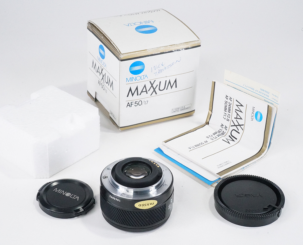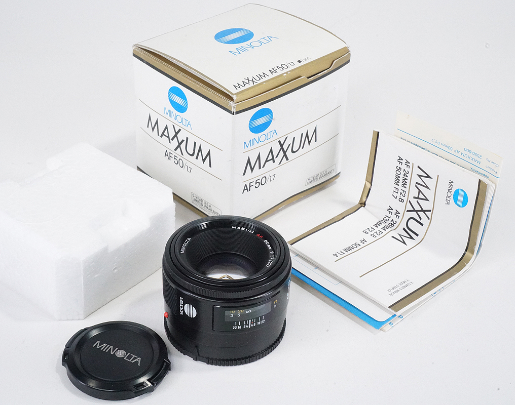50/1.7 MINOLTA MAXXUM AF, CROSSED XX, BUILT-IN SHADE, FIVE CONTACTS, WITH BOX (WRITTEN ON ONE SIDE), FOAM PACKING, BOTH CAPS, INSTRUCTIONS, WARRANTY INFORMATION AND REGISTRATION CARD (NUMBERS MATCH), GLASS HAS LIGHT HAZE PLUS A LITTLE DUST AND DEBRIS, LOOKS EX+