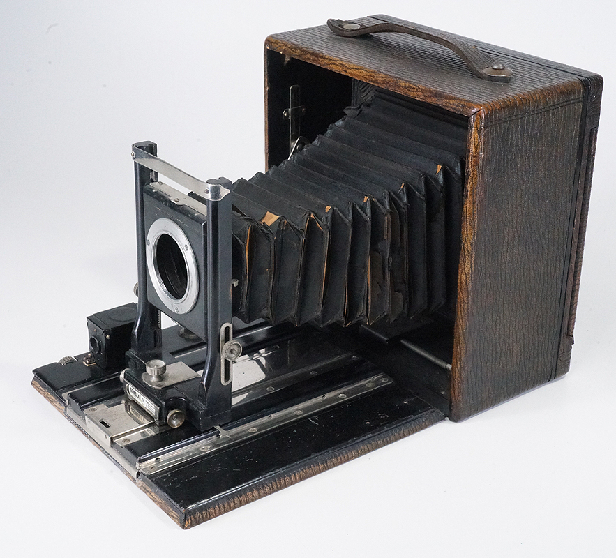 IN A WORN CASE. SHUTTER WORKS, LENS HAS HEAVY FUNGUS, BELLOWS ARE