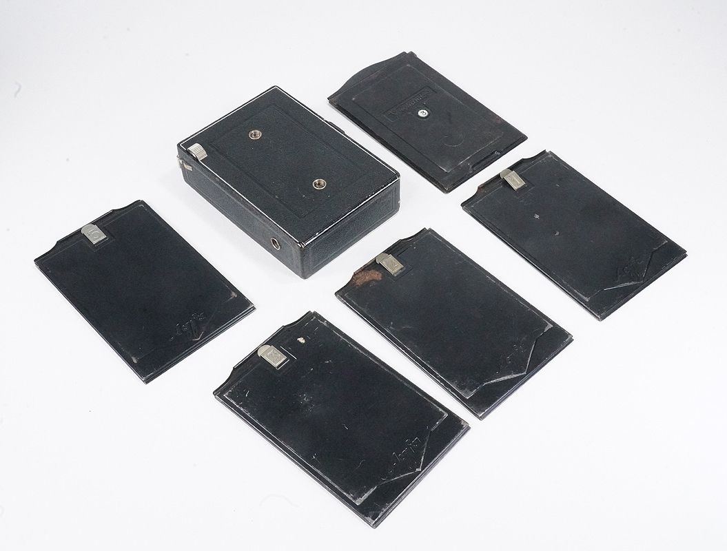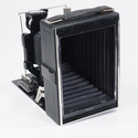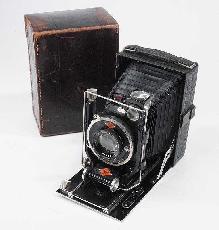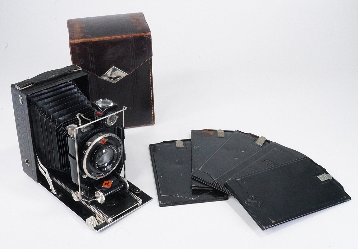AGFA ISOLAR, 135/4.5 SOLINAR (HAZE, DEPOSITS), BAD DIAPHRAGM, AS-IS/226224 $75AGFA ISOLAR, 135/4.5 SOLINAR IN COMPUR RIM SET, 9X12CM, WITH WORN CASE (HANDLE MISSING) AND FIVE MARGINAL PLATE HOLDERS (FOUR AGFA, ONE VOIGTLANDER), ALL WITH DARK SLIDES, NO FOCUSING PANEL OR PLATE HOLDER LOCK, SHUTTER WORKING BUT AT LEAST A FEW DIAPHRAGM BLADES ARE DISLODGED RESULTING IN ABOUT 75% LIGHT BLOCKAGE, BELLOWS APPEAR LIGHT TIGHT, GLASS HAS STRONG HAZE WITHIN THE FRONT CELL, BUBBLE INTACT, OPTICAL FINDER FAIRLY DIRTY, FOCUS A LITTLE STIFF, FRONT STANDARD WOBBLES A BIT ON FOCUS RACK, SOLD AS-IS FOR DISPLAY OR REPAIR, LOOKS EX/EX-