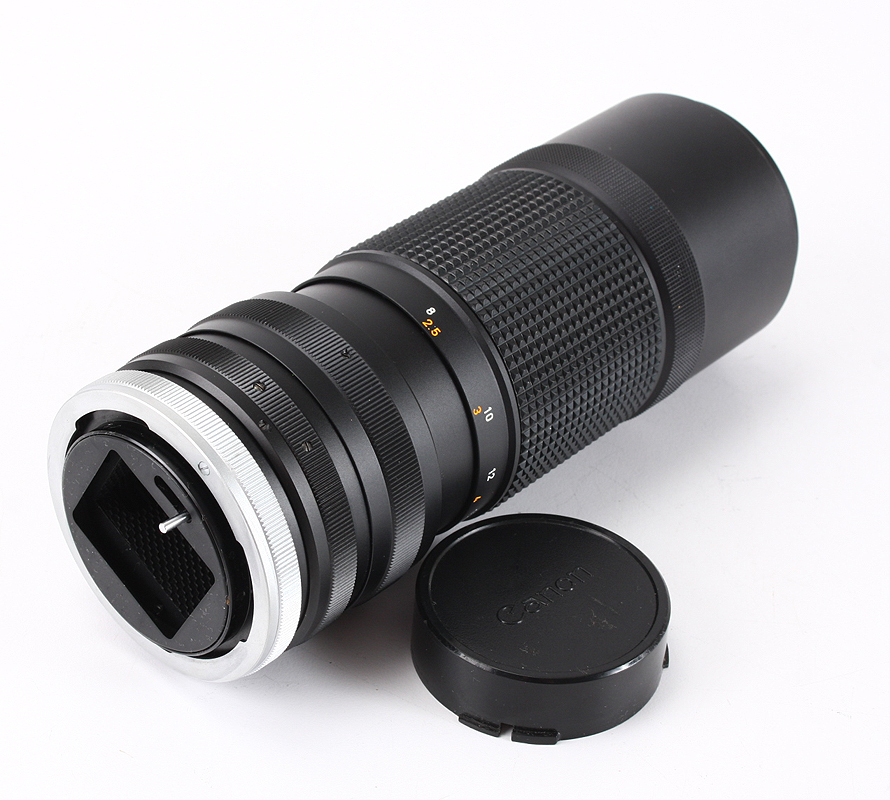 100-200/5.6 CANON FD-N, BUILT-IN HOOD, GLASS HAS DUST AND DEBRIS, LOOKS EX-