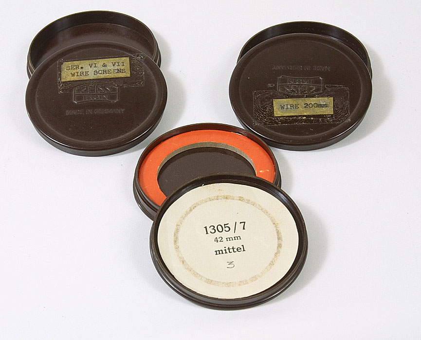 ZEISS FILTER CASES, SET OF THREE, UNUSUAL ROUND BROWN BAKELITE, ONE HAS PAPER FOR A 1305/7, 42MM IN IT, EX
