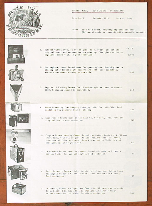 MICHEL AUER'S CAMERA LIST NO. 1, WITH PICTURES, MAR 1971, EX