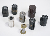 KIN-O-LUX FILM CASSETTES (THE CAN IS MARKED, THE CASSETTES ARE NOT), SIX ODD CASSETTES THAT OPEN IN THE MIDDLE, PLUS AN EXTRA SPOOL AND A BAKELITE CAN, LOOKS EX-