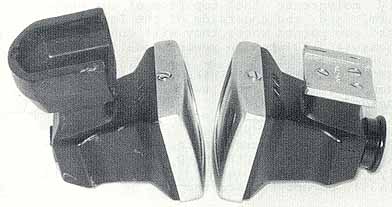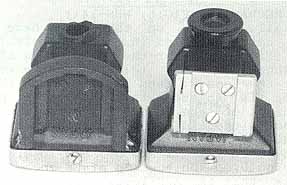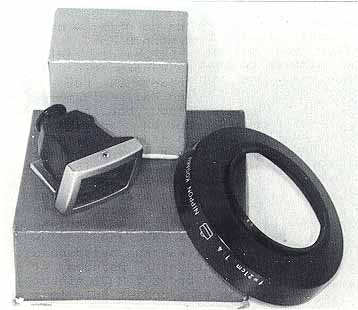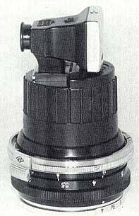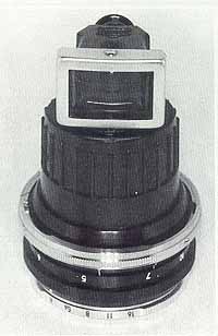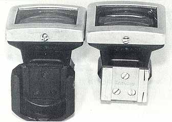 | The photos on this page illustrate the difference between the RF and reflex versions of the finder I did not have space in my book to show this although I did mention it in the text. Except for the different shoes these finders are absolutely Identical! Yet another type was made for the 'IF" which has a metal shoe instead of plastic, but I could not obtain one for this article. However, again the finder is the same and only the shoe varies The photo to the left shows the 'IF" version mounted on the special dovetail shoe unique to the reflex Nikons. So now I hope what I was talking about in my book finally makes sense! |