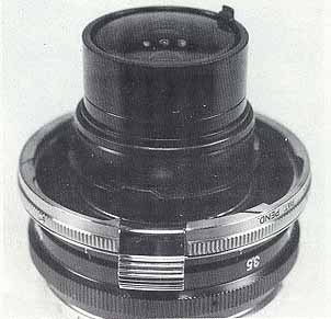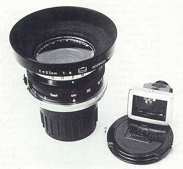 The eight element 21mm/f4.0 Nikkor was of an advanced optical design using rare earth elements and modern coatings. It's layout was nearly symmetrical with the diaphragm placed squarely at the midpoint. Except for a small modification to the rear element, the S and F versions of this lens were optically identical, since the reflex lens was used with the mirror locked up and a separate finder. The barrel design of the RF 21mm Nikkor was very similar to the new series of Auto-Nikkors released with the Nikon F. That is it had the same satin black design accentuated by one or more chrome rings. The diaphragm was of the more modern equidistant type and the engraving of the front identification was identical in style to that used on the new 50mm/f2.0 Auto-Nikkor. The end result was a lens that appeared more reflex like than the one that was actually made for the "F" and very unlike any of the other wide angles made for the rangefinder series! It looked, and still looks very modern, even by today's standards. I am pointing all of this out in order to support my statement that Nippon Kogaku still felt committed to the rangefinder series. Here we have a lens that arrived very near what turned out to be the end of the RF era at Nikon, yet it is more impressive than its reflex counterpart, and demonstrates that Nikon was willing to put new research and development into the rangefinder system. This lens, along with the 1000mm/f6.3, 350mm/f4.5 in semiautomatic mount, and a completely redesigned 50mm/fl.1, represent many hours of work as well as a great deal of Yen. It seems doubtful that any company would put this amount of effort into a system they were ready to discontinue. I feel that Nippon Kogaku really thought that the "S" and "F" series would coexist for quite some time, possibly through the sixties, and didn't foresee the massive success of the Nikon F and eventual "squeezing" out of the rangefinder system. Whatever the circumstances, the result was one of the most collectible Nikkors in the entire RF series, and a real prize today!