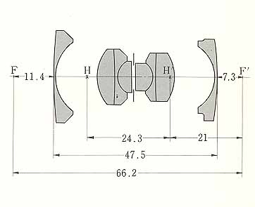 Above right...Lens #621001 which is probably the first production lens in this series!! Nippon Kogaku would generally give the first item off the assembly line a number ending in "001" and not "000". It is shown here with its proper screw in shade...Bill Kraus Left three photos...This is lens #621011 which would be the 11th 21mm Nikkor made. In these photos is shown not only the correct shade but also the rear cap as well as 21mm finder. Note that the rear cap has the provision for mounting the finder for storeage purposes and and that the front cap is the usual 43mm snap-on type. The bottom photo shows this lens mounted on a Nikon SP...Mike Symons Bottom right...The optical formula for the 21mm Nikkor. Note that it is nearly a symetrical design and that the diaphragm is centerally located. This same formula was used for the reflex version as well.